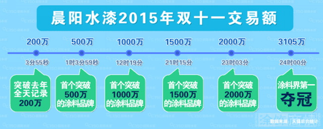 2015年11月11日0点网购盛宴正式开场,晨阳水漆在天猫双11活动中,用时仅3分55秒,天猫平台销售额破200万;分别用时1小时3分59秒破500万、12小时19分销售额破1000万、21小时15分破1500万,23是03分破2000万,24小时3105万成为天猫涂料品类全网最快商家,更是接棒去年天猫双十一多乐士的销售额桂冠,民族水漆品牌——晨阳水漆以环保健康理念撑起民族涂料品牌骄傲。