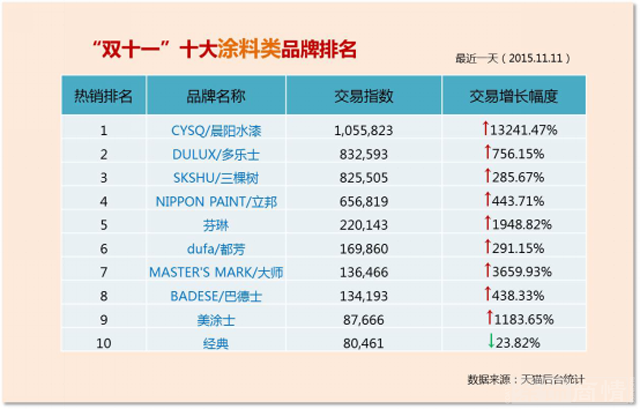 晨阳水漆勇夺天猫双11涂料品类销售额第一