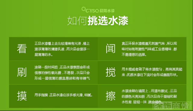 基于用户的环保消费需求,催生传统油漆涂料品牌,不低于300家转型与研发生产水漆,推动以晨阳水漆为首的水漆行业进入高速发展时段。也基于此,各地传统油漆销售渠道纷纷转行,支持环保水漆的环保化发展进程。2015年7月一个水漆工的自白发起了《职业扫盲体》兴起了油漆工转行的大潮就是佐证。
