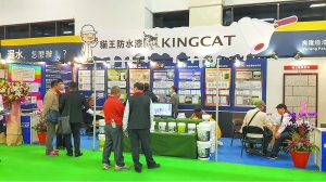 图为上个月在台北举行的一次建材展上,一家涂料企业的展台