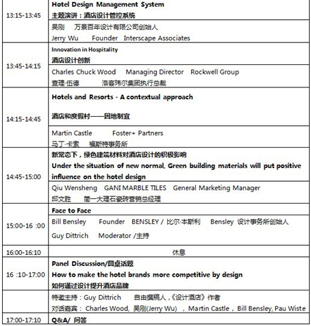 知名设计大师将就“酒店设计创新”、“酒店设计运营管理”、“酒店设计品牌概念塑造”等话题分享他们的成功经验和前沿理念,打造一台设计思想盛宴!欧洲精品酒店界知名媒体人Guy Dittrich将代表中国广大设计师对话Bill Bensley,并主持圆桌话题环节的讨论将把整场会议推向高潮。《设计家》杂志许晓东主编将担纲主持本次论坛。